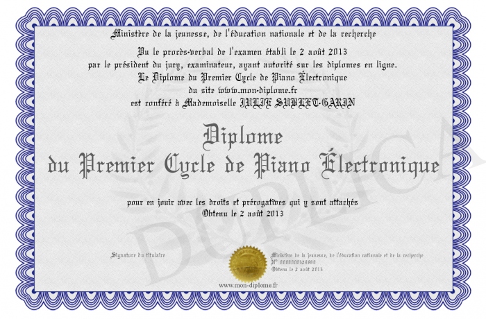Envoyez par email votre Diplôme du Premier Cycle de Piano Électronique personalisé