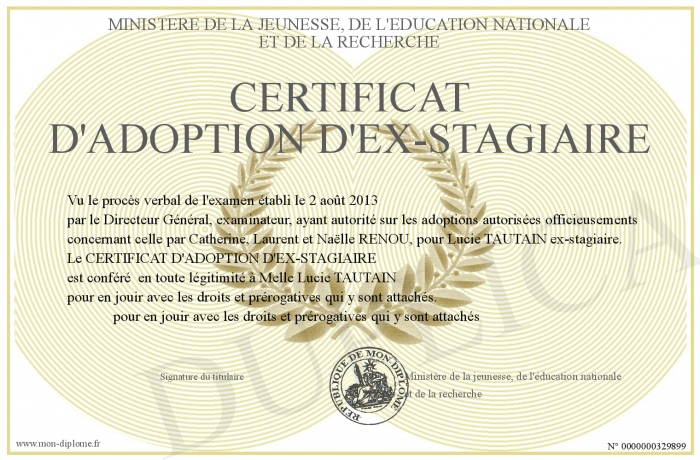 Envoyez par email votre CERTIFICAT D'ADOPTION D'EX-STAGIAIRE personalisé