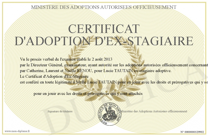 Envoyez par email votre Certificat d'Adoption d'Ex-Stagiaire personalisé