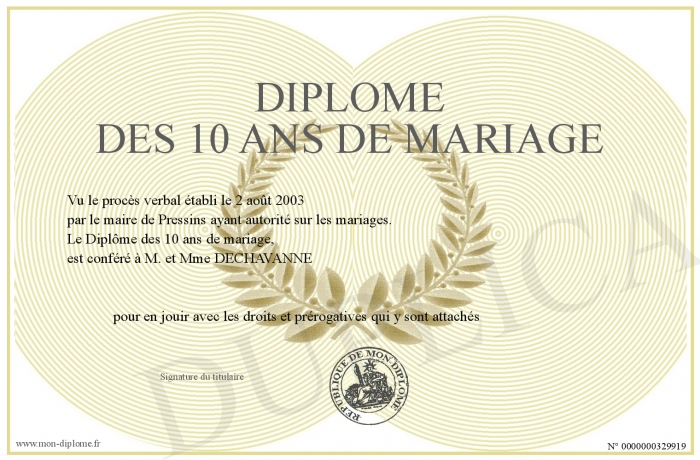 Envoyez par email votre DIPLOME DES 10 ANS DE MARIAGE personalisé