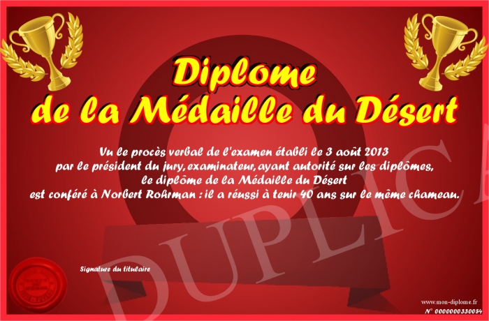 Envoyez par email votre Diplôme de la Médaille du Désert personalisé