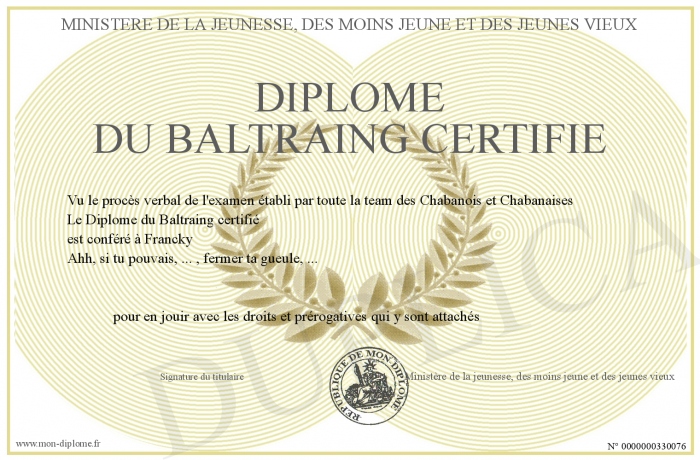 Envoyez par email votre Diplôme du Baltraing certifié personalisé