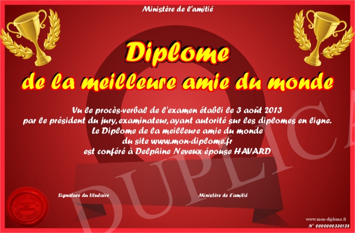 Envoyez par email votre Diplôme de la meilleure amie du monde personalisé