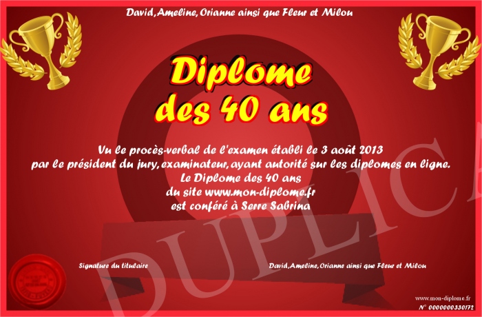 Envoyez par email votre Diplôme des 40 ans personalisé