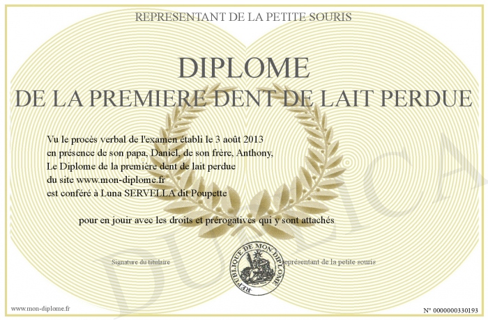 Envoyez par email votre Diplôme de la première dent de lait perdue personalisé