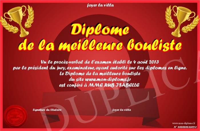 Envoyez par email votre Diplôme de la meilleure bouliste personalisé