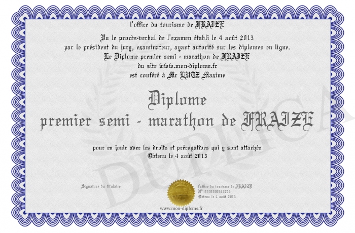Envoyez par email votre Diplôme premier semi - marathon de FRAIZE personalisé