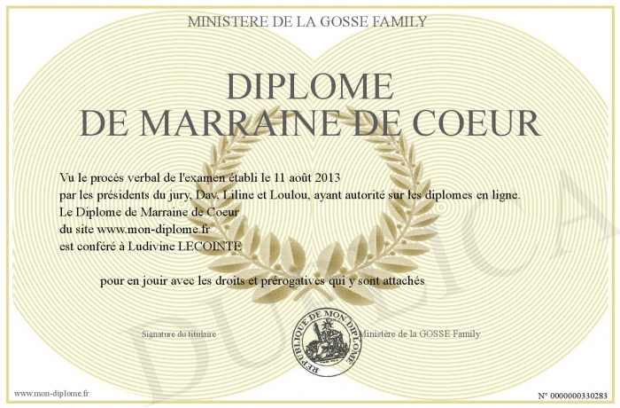 Envoyez par email votre Diplôme de Marraine de Coeur personalisé