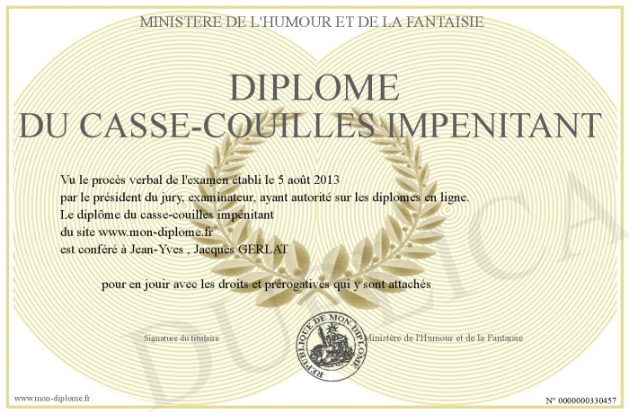 Envoyez par email votre Diplôme du casse-couilles impénitant personalisé