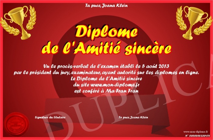 Envoyez par email votre Diplôme de l'Amitié sincère personalisé