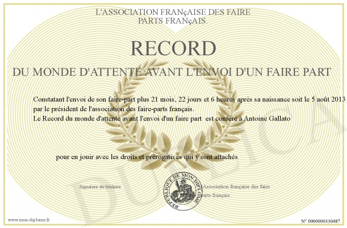 Envoyez par email votre Record du monde d'attente avant l'envoi d'un faire part personalisé