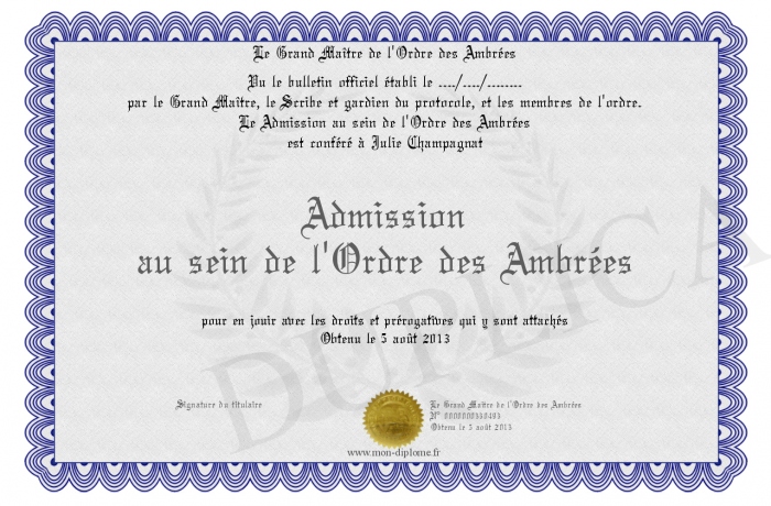 Envoyez par email votre Admission au sein de l'Ordre des Ambrées personalisé