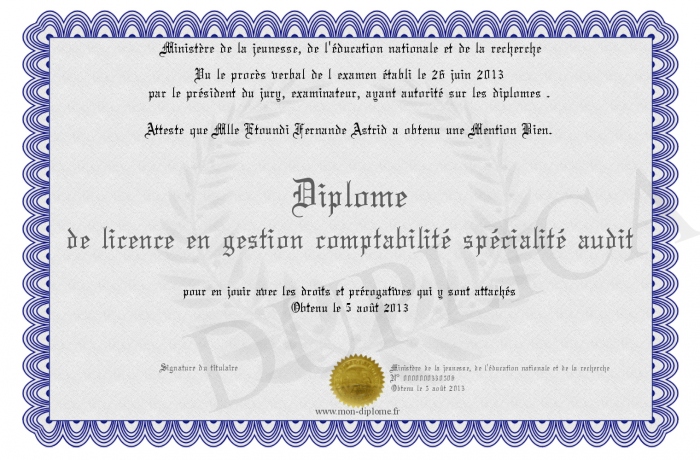 Envoyez par email votre Diplôme de licence en gestion comptabilité spécialité audit personalisé