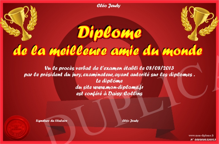 Envoyez par email votre Diplôme de la meilleure amie du monde personalisé