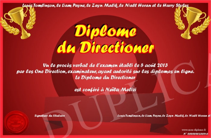 Envoyez par email votre Diplôme du Directioner personalisé