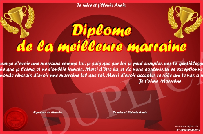 Envoyez par email votre Diplôme de la meilleure marraine personalisé