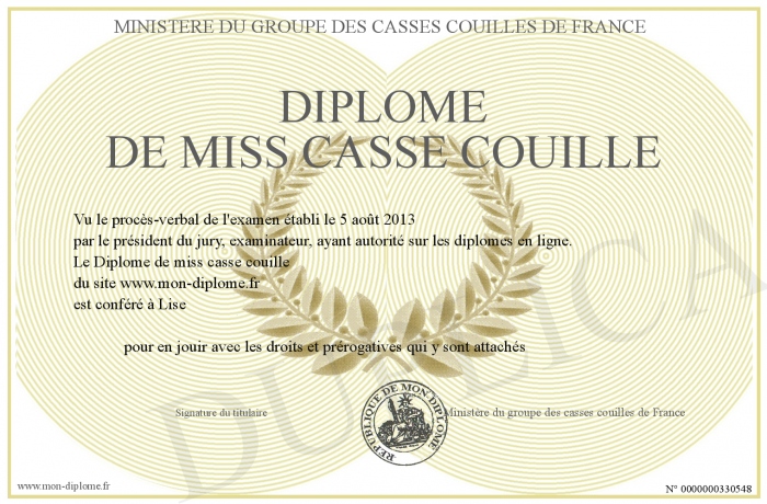 Envoyez par email votre Diplôme de miss casse couille personalisé