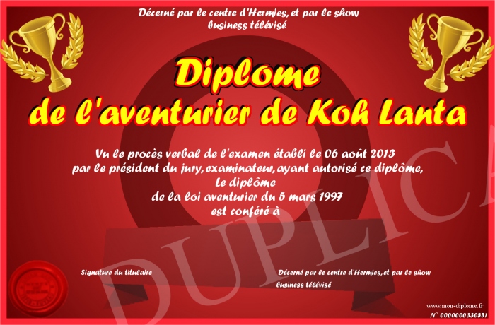 Envoyez par email votre Diplôme de l'aventurier de Koh Lanta personalisé