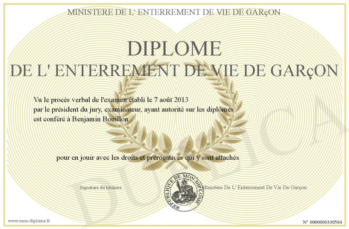 Envoyez par email votre Diplôme De L' Enterrement De Vie De Garçon personalisé