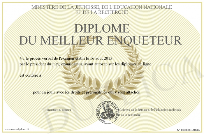 Envoyez par email votre Diplôme du meilleur enqueteur personalisé