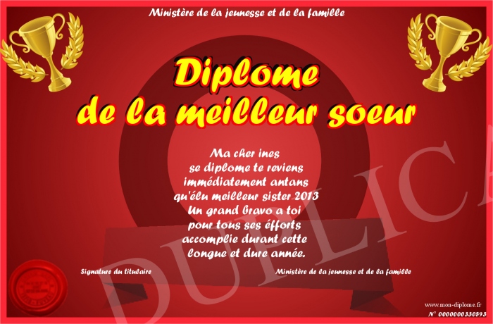 Envoyez par email votre Diplôme de la meilleur soeur personalisé