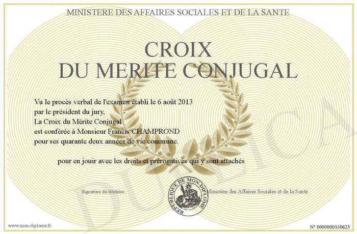 Envoyez par email votre Croix du Mérite Conjugal personalisé