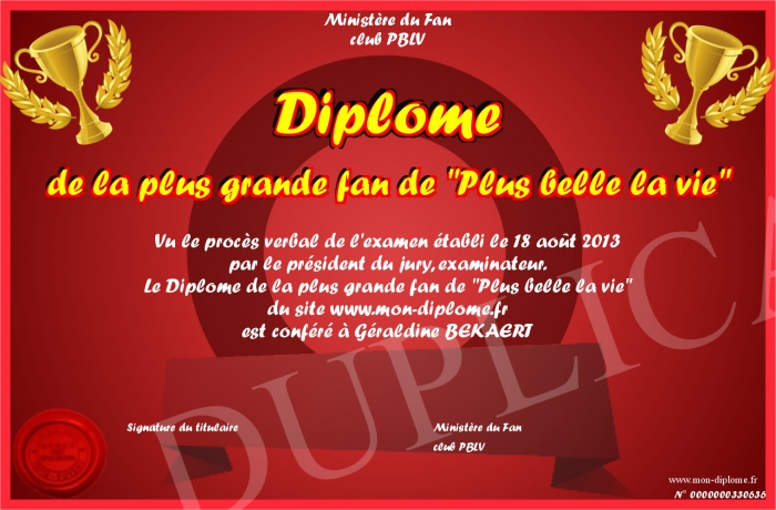 Envoyez par email votre Diplôme de la plus grande fan de -Plus belle la vie- personalisé