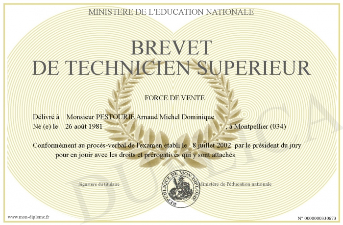 Envoyez par email votre BREVET DE TECHNICIEN SUPERIEUR personalisé