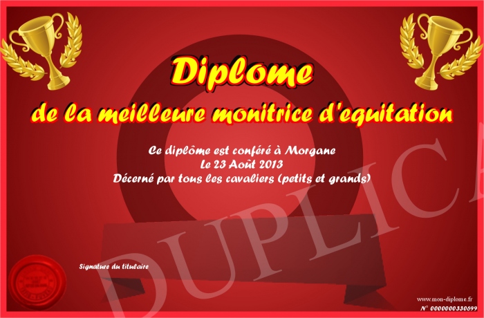 Envoyez par email votre Diplôme de la meilleure monitrice d'equitation personalisé
