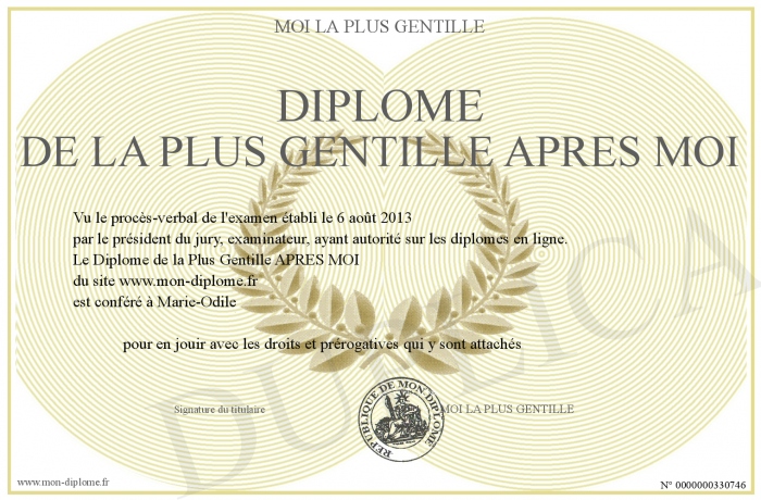Envoyez par email votre Diplôme de la Plus Gentille APRES MOI personalisé