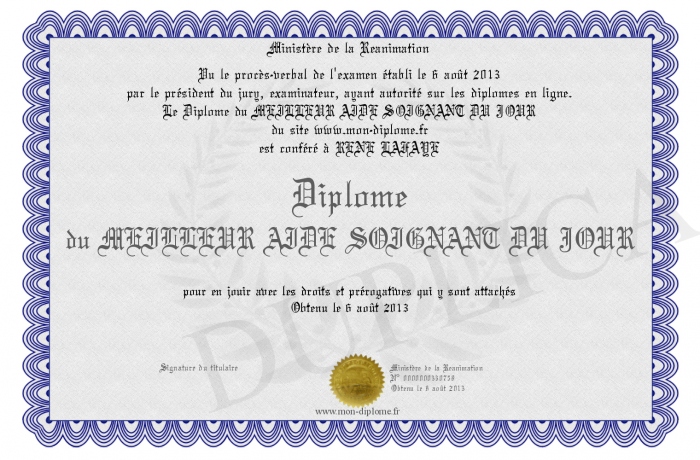 Envoyez par email votre Diplôme du MEILLEUR AIDE SOIGNANT DU JOUR personalisé