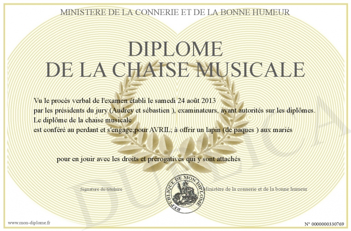 Envoyez par email votre Diplôme de la chaise musicale personalisé