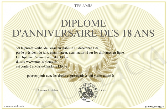 Envoyez par email votre Diplôme d'anniversaire des 18 ans personalisé