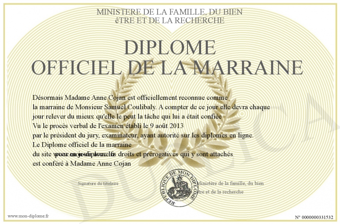 Envoyez par email votre Diplôme officiel de la marraine personalisé