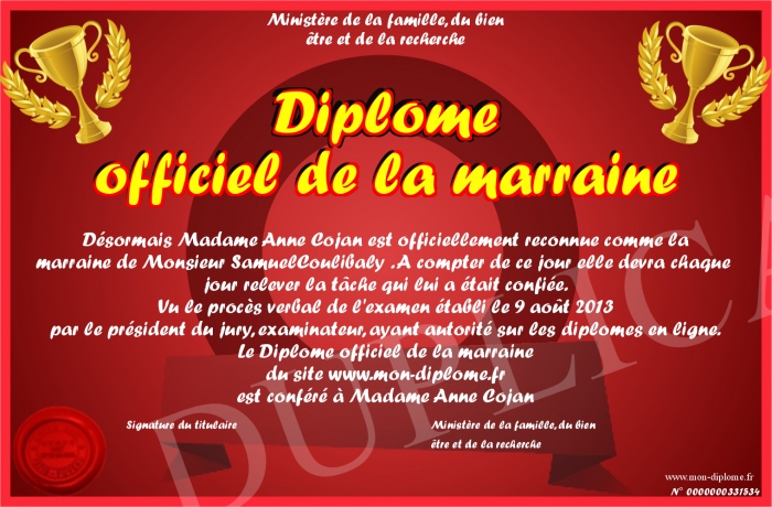 • Diplôme officiel de la marraine