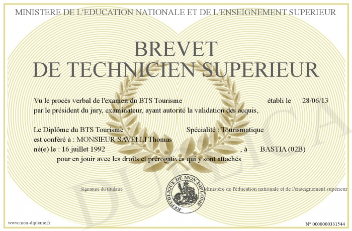 Envoyez par email votre BREVET de Technicien Supérieur personalisé