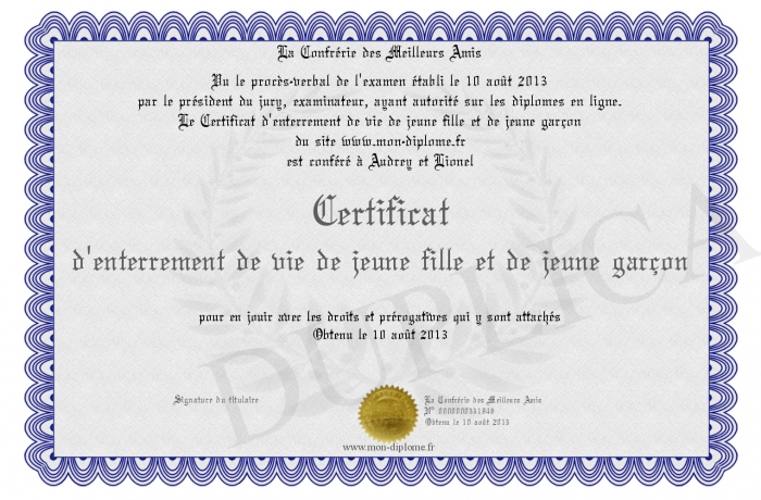 Envoyez par email votre Certificat d'enterrement de vie de jeune fille et de jeune garçon personalisé