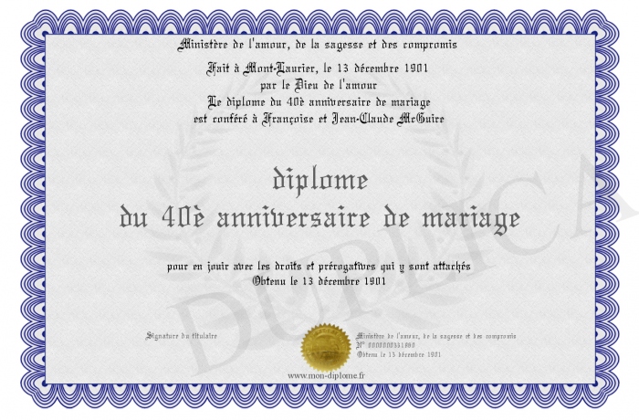 Envoyez par email votre diplôme du 40è anniversaire de mariage personalisé