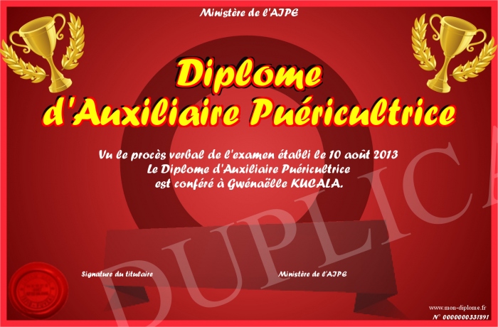 Envoyez par email votre Diplôme d'Auxiliaire Puéricultrice personalisé