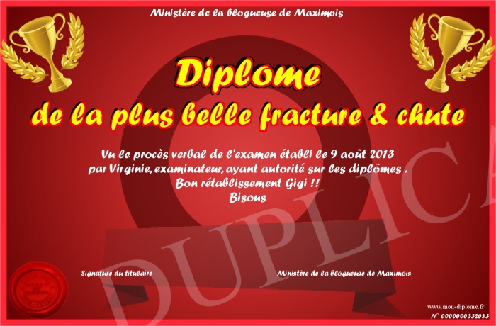 Envoyez par email votre Diplôme de la plus belle fracture & chute personalisé