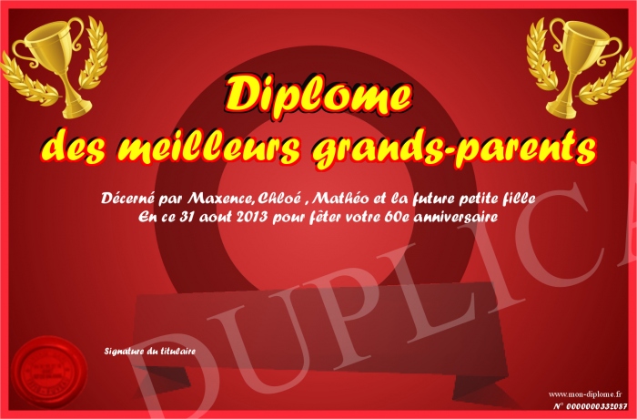 Envoyez par email votre Diplôme des meilleurs grands-parents personalisé