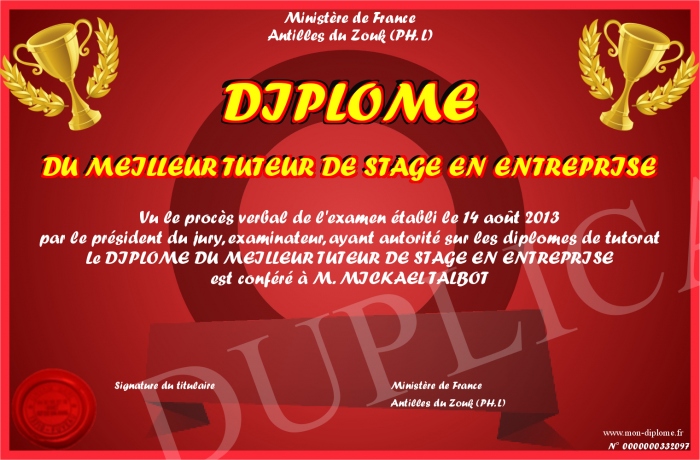 Envoyez par email votre DIPLOME DU MEILLEUR TUTEUR DE STAGE EN ENTREPRISE personalisé