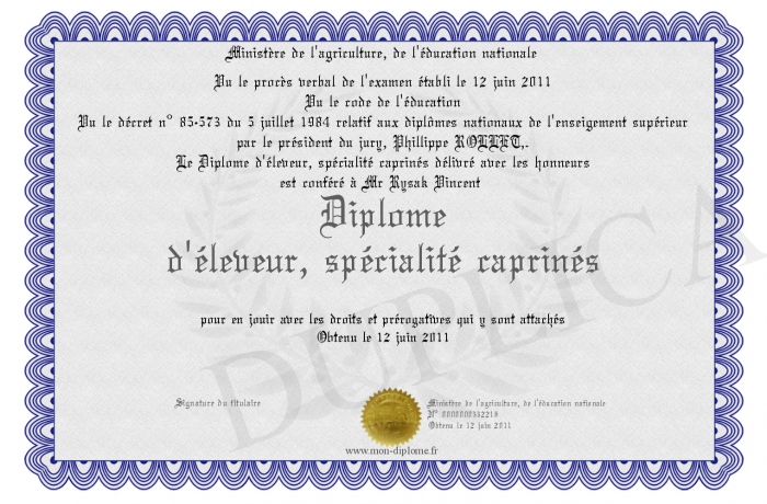 Envoyez par email votre Diplôme d'éleveur, spécialité caprinés personalisé