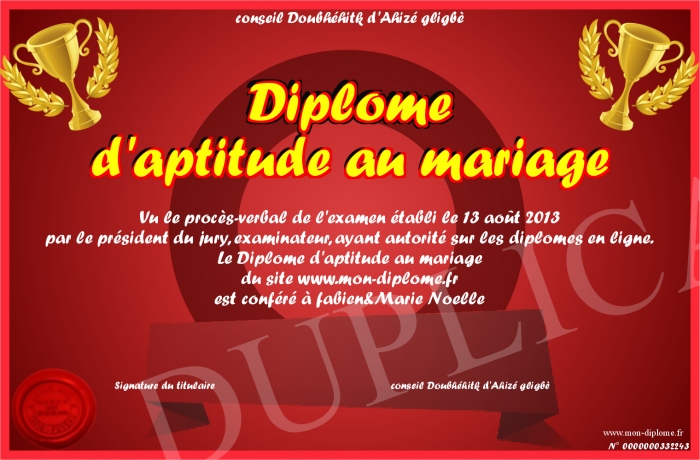 Envoyez par email votre Diplome d'aptitude au mariage personalisé