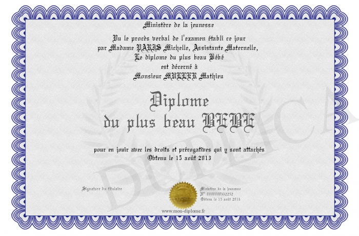 Envoyez par email votre Diplôme du plus beau BEBE personalisé