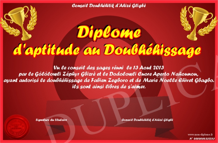 Envoyez par email votre Diplome d'aptitude au Doubhéhissage personalisé