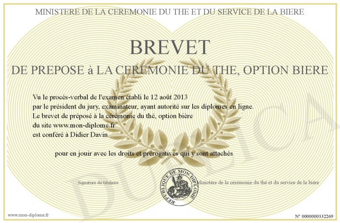 Envoyez par email votre brevet de préposé à la cérémonie du thé, option bière personalisé
