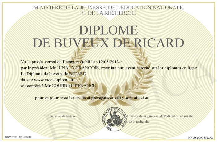 Envoyez par email votre Diplôme de buveux de RICARD personalisé