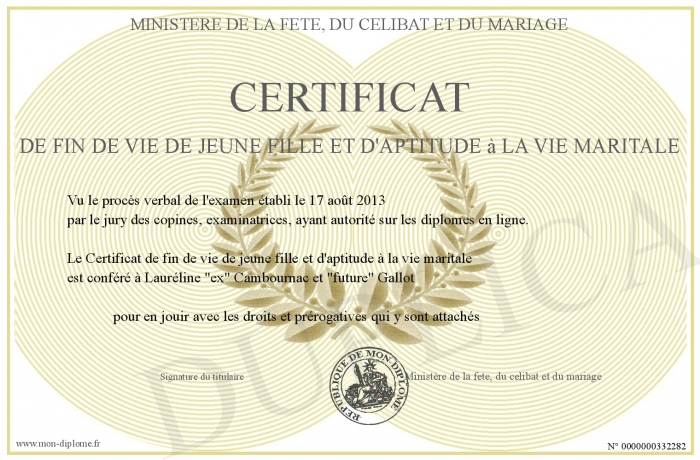 Envoyez par email votre Certificat de fin de vie de jeune fille et d'aptitude à la vie maritale personalisé