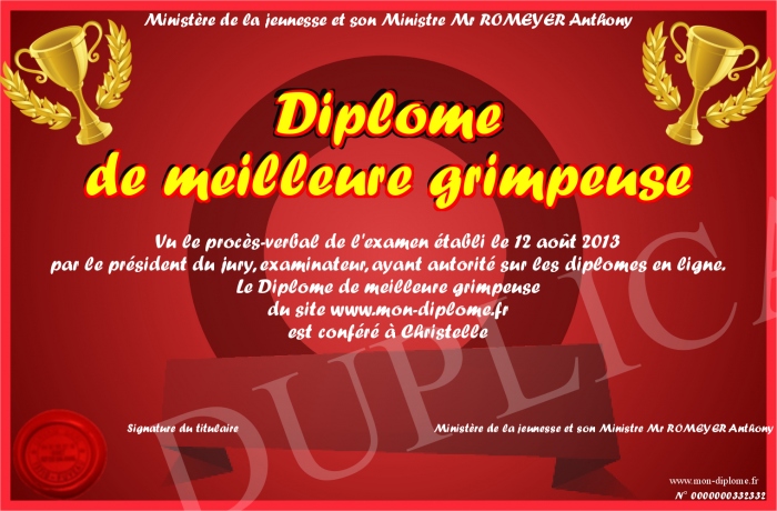 Envoyez par email votre Diplôme de meilleure grimpeuse personalisé